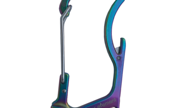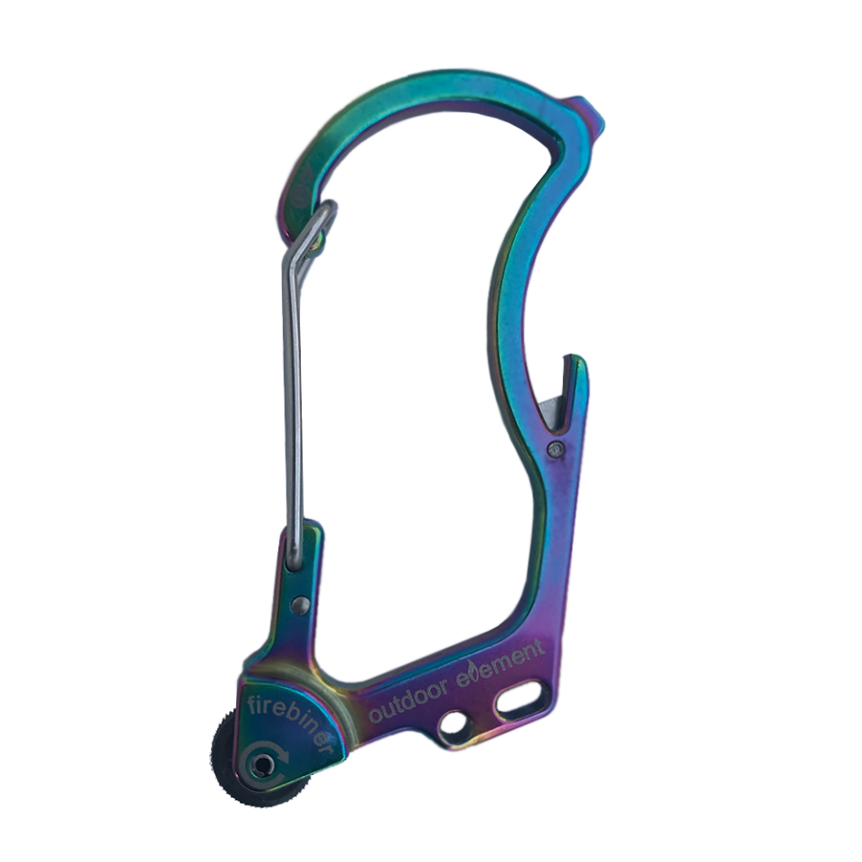 Fire-starting Carabiner. 1oz, stainless steel, rated for 100 pounds of gear with integrated screwdriver, bottle opener, small utility blade, hang slots and an EverSpark fire wheel.