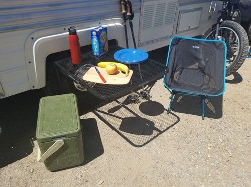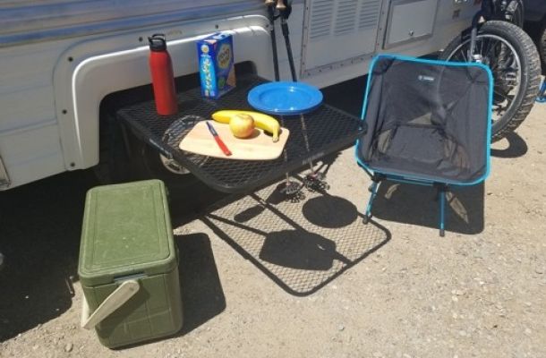 The steel, powder coated, tire mounted table is level, stable, VERY accessible. and weighs less than 13 pounds.